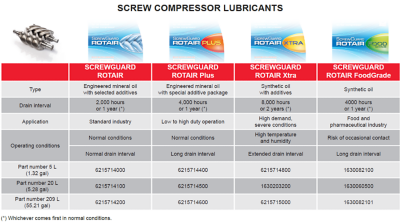 With special ScrewGuard Rotair lubricants to maximize the life if your Screw Compressor, we have 4 available options: 1. ScrewGuard Rotair, 2. ScrewGuard Rotair Plus, 3. ScrewGuard Rotair Xtra, and 4. ScrewGuard Rotair FoodGrade.