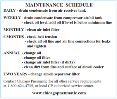 컴프레셔를 얼마나 자주 가동하는지에 따라 기계를 얼마나 자주 정비해야 하는지 파악하는 데 도움이 됩니다. 컴프레셔를 가끔 가동하는 경우 연간 서비스만으로도 충분합니다. 지속적으로 작동하는 경우, 피할 수 있는 문제에 앞서 나가기 위해 분 기별 서비스 가 필요할 수 있습니다. 매뉴얼에는 공기 컴프레셔를 최적의 효율로 가동하기 위한 권장 서비스 및 유지보수 일정이 설명되어 있습니다.